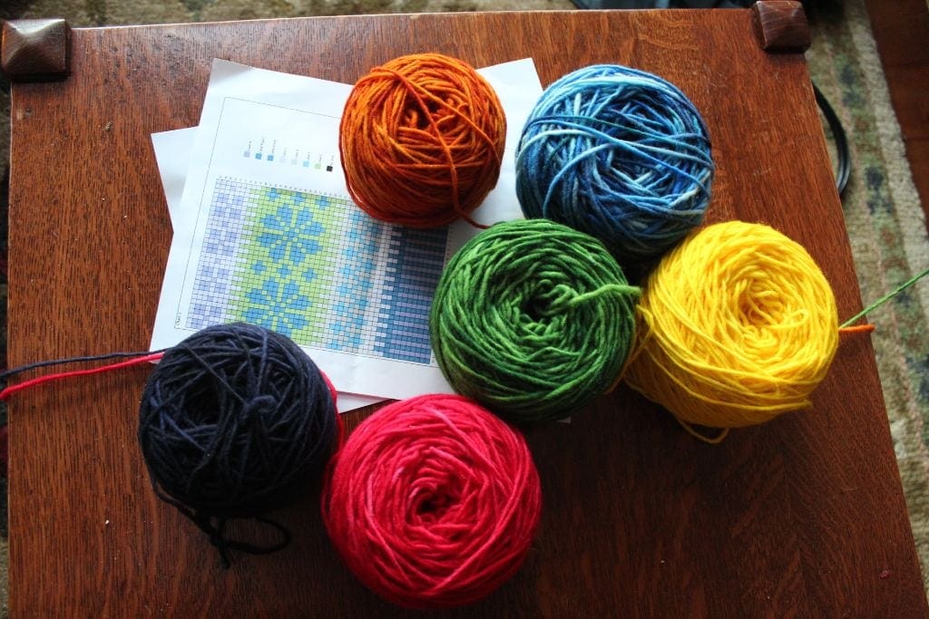 While the vest was underway, I took five white skeins of the same yarn and experimented with dying in different colors. While there aren’t many variables to dying, it seems like such a leap of faith to submerge pure white merino wool into a pan of colored water. I’m happy with most of the results but that yellow is way too much. I think I’ll dye that again to tone it down.