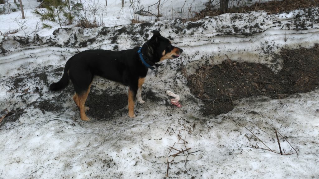 Finally, on today’s morning walk, Jack found a severed lamb leg on Wallace Road. I tossed it over the snowbank. On our way back, Jack picked it up and carried it back to the farm – at least a mile – and played with it outside. Peg wondered if it might be from the Teachouts flock, which is on the other side of the valley.