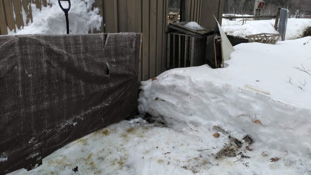 A little more shoveling to make a path from the boys yard to the opening and from the opening to the barn, and I’m done. I wedge a piece of plywood under the left end of panel so it won’t refreeze. Mission accomplished in about 45 minutes.