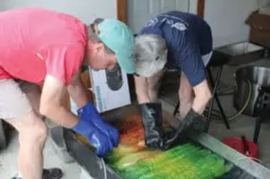 Peg was in the middle of dying some yarn in the garage, so we set up some stools in the driveway and he turned on his recorder. We chatted for about 30 minutes.